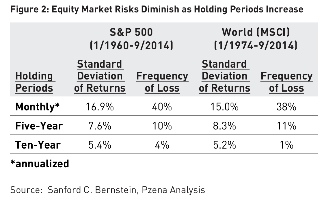 One of the elements causing investors to take a short-term approach is volatility. The common way in which volatility is measured is called standard deviation. If you are not familiar with the term, think of it this way: Assume you are given a group of numbers and are asked to calculate the average value (mean) of those numbers. Standard deviation measures the difference between each data point and the group’s mean; i.e., it tells us how spread out the numbers are. The standard deviation (or volatility) of the returns on stocks held in a portfolio is a common measure of risk.