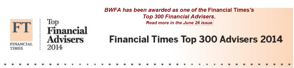 Disclosure: The 2014 Financial Times Top 300 Registered Investment Advisors is an independent listing produced by the Financial Times (June, 2014). The list was compiled using information prepared and submitted by the advisors, regulatory disclosures, and the FT’s research. The ranking is based on a firm’s assets under management, asset growth rate, years in existence, compliance record, industry certifications, and online accessibility. A more thorough disclosure of the criteria used in making these rankings is available upon written request to the advisor. Neither the RIA firms nor their employees pay a fee to Financial Times in exchange for inclusion in the FT 300.