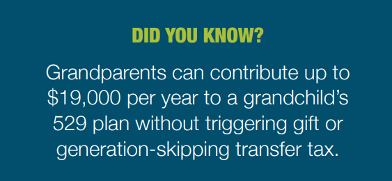 If you contribute no more than $19,000 to your grandchild’s 529 account during the tax year (and have made no other gifts to your grandchild that year), there will be no federal tax consequences — your gift qualifies for the annual federal gift tax exclusion, and it is also excluded for purposes of the GSTT.